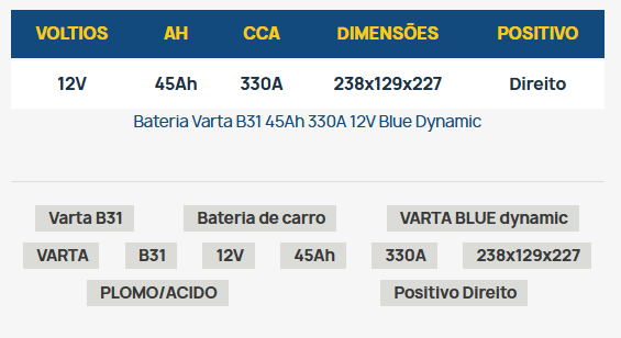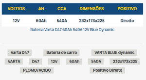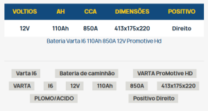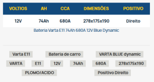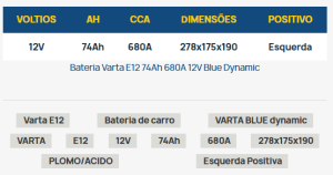 | Description | Bateria BOSCH 12V 75 AH (+ Dir.) | ![]() | Bateria BOSCH12V 64 AH (+ Esq.) | ![]() | Bateria Varta Promotive Black 155 AH - Preta por VARTA | ![]() | ||||||