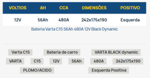 Seu veículo possui bateria original do fabricante?A bateria Varta G7 95Ah 830A 12V é compatível com algumas baterias de equipamento original. As baterias de equipamento original são as baterias que os fabricantes instalam quando vendem um veículo novo ou que normalmente são instaladas por concessionários oficiais. Para descobrir se a bateria Varta G7 é compatível com a bateria original do fabricante, procure o código que aparece em sua bateria na seguinte lista de fabricantes e referências de equipamento original. Se o código aparecer na lista e o restante das características corresponderem, você pode substituir sua bateria original por a bateria Varta G7 com total tranquilidade. | Bateria Varta C15 56Ah 480A 12V