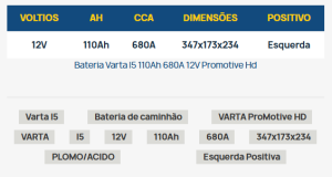 - Marca líder: A marca Varta, com mais de 125 anos de história, é a fabricante líder mundial de baterias automotivas. Sua bateria Varta C30 foi fabricada pelo fabricante número um do setor.